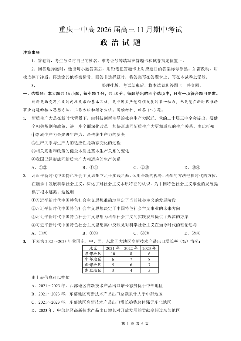 重庆市第一中学校2025-2026学年高三上学期11月月考 政治.pdf