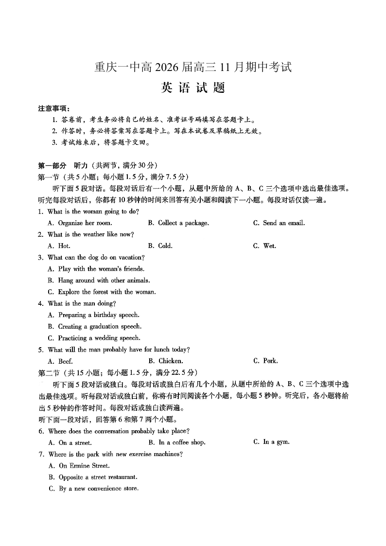 重庆市第一中学校2025-2026学年高三上学期11月月考 英语.pdf