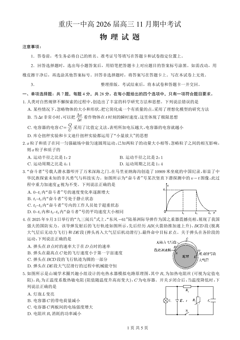 重庆市第一中学校2025-2026学年高三上学期11月月考 物理.pdf