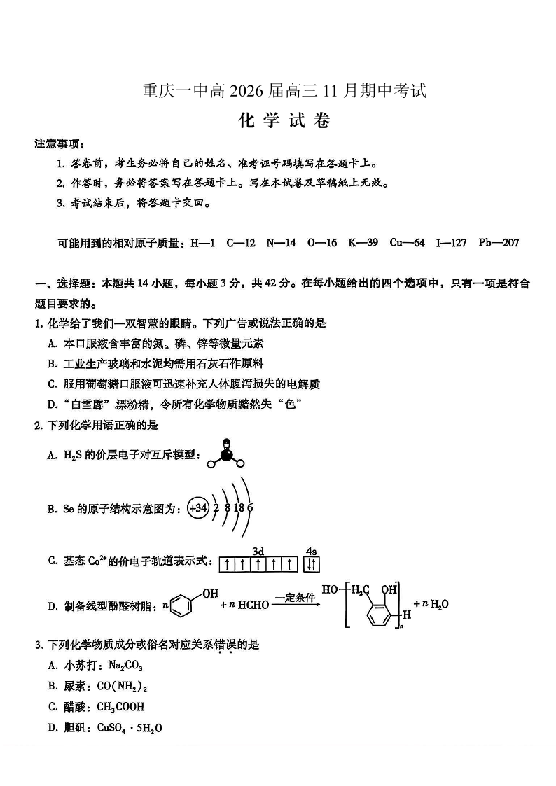 重庆市第一中学校2025-2026学年高三上学期11月月考 化学.pdf