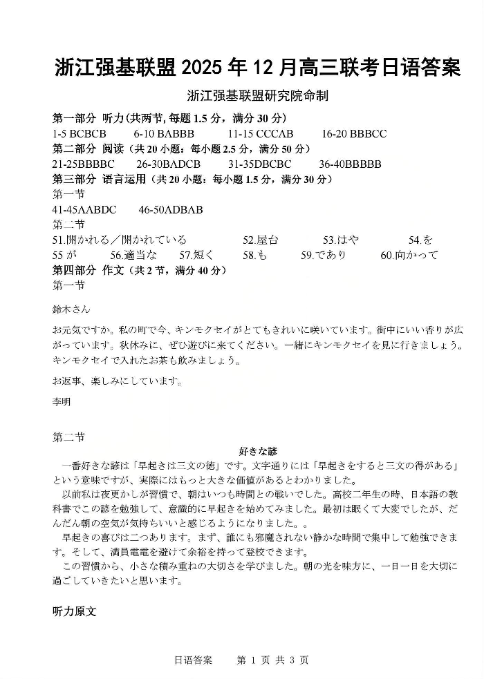 浙江强基联盟2025年12月高三联考 日语答案.pdf