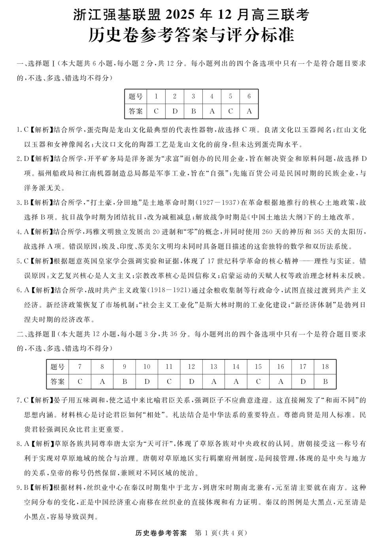 浙江强基联盟2025年12月高三联考 历史答案.pdf