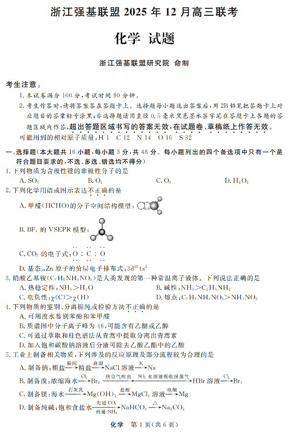 浙江强基联盟2025年12月高三联考 化学.pdf