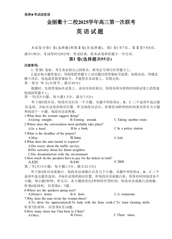 金丽衢十二校2025学年高三第一次联考 英语.doc