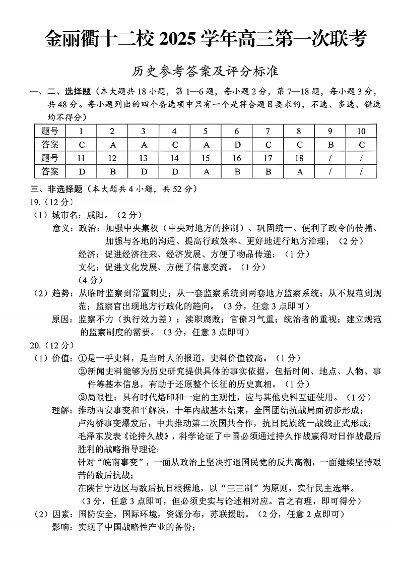 金丽衢十二校2025学年高三第一次联考 历史答案.pdf