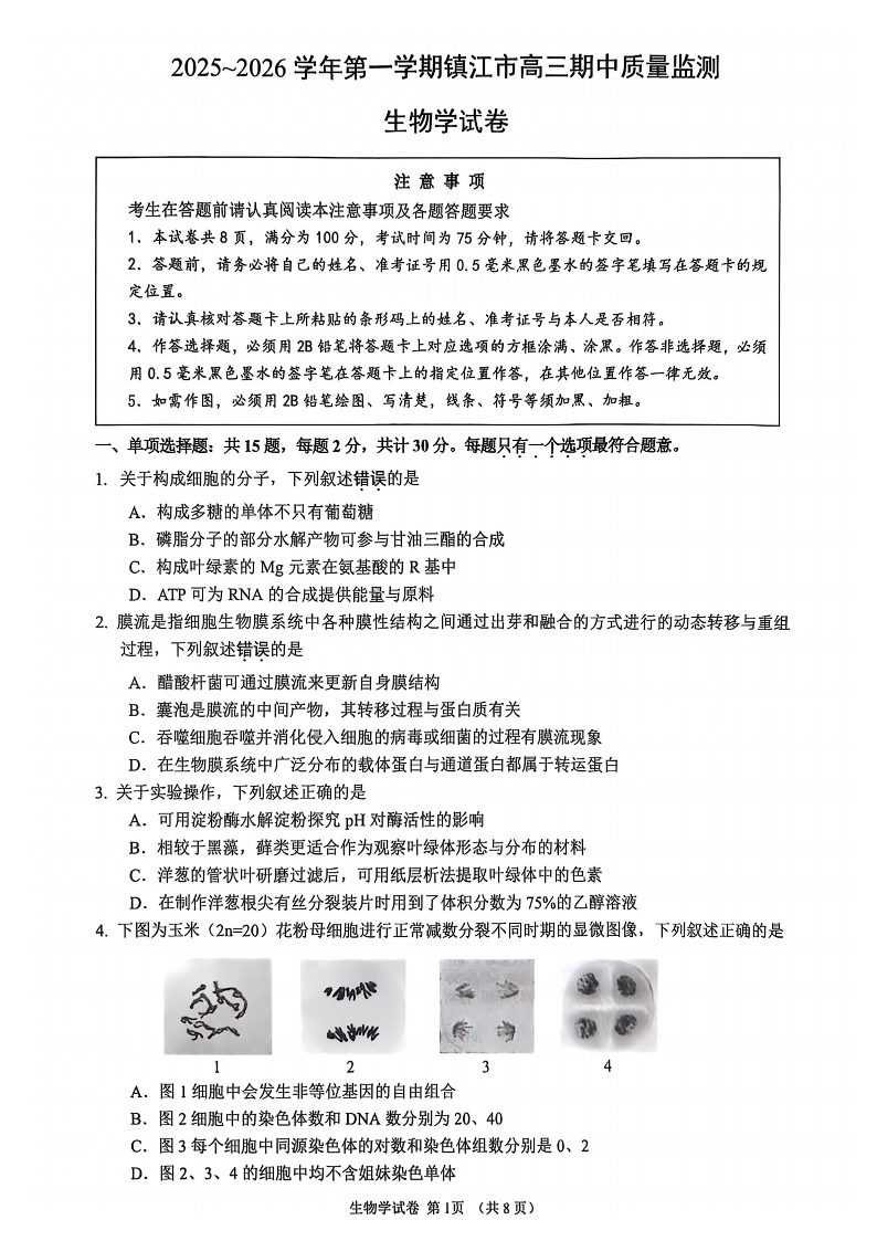 镇江市2025~2026学年第一学期高三期中质量监测 生物试题(含答案).pdf