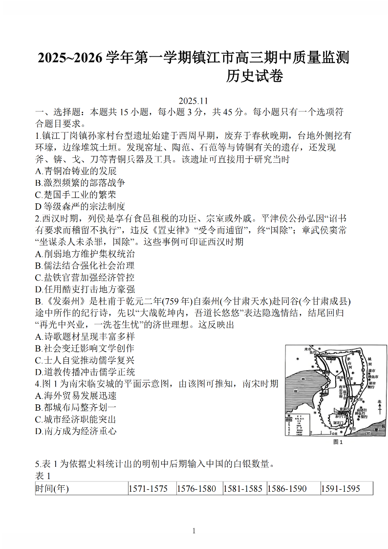镇江市2025~2026学年第一学期高三期中质量监测 历史试题(含答案).pdf