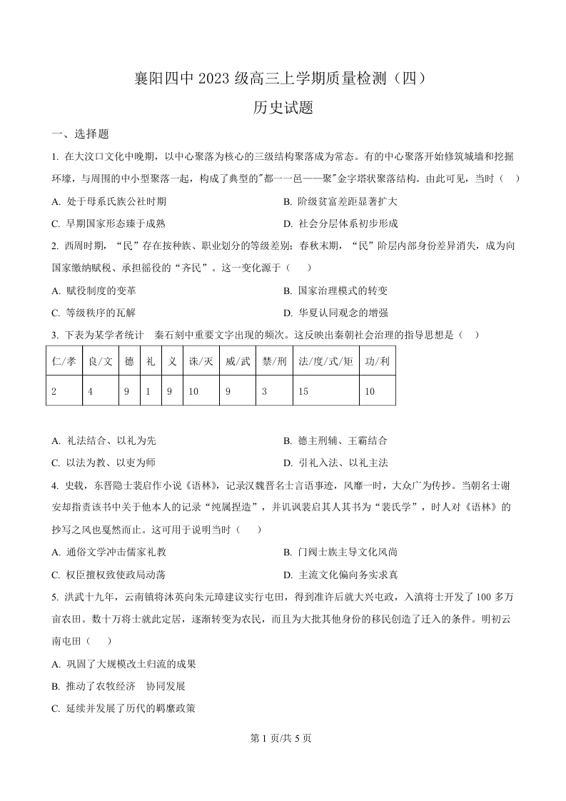 湖北省襄阳市第四中学2026届高三上学期12月月考 历史.docx
