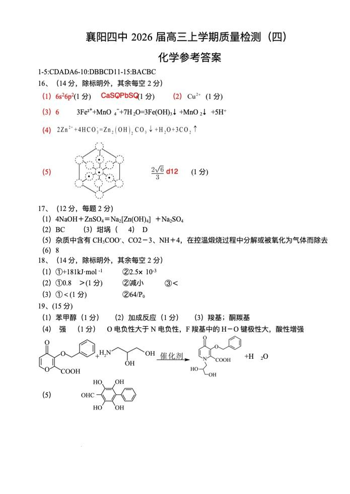 湖北省襄阳市第四中学2026届高三上学期12月月考 化学答案.pdf