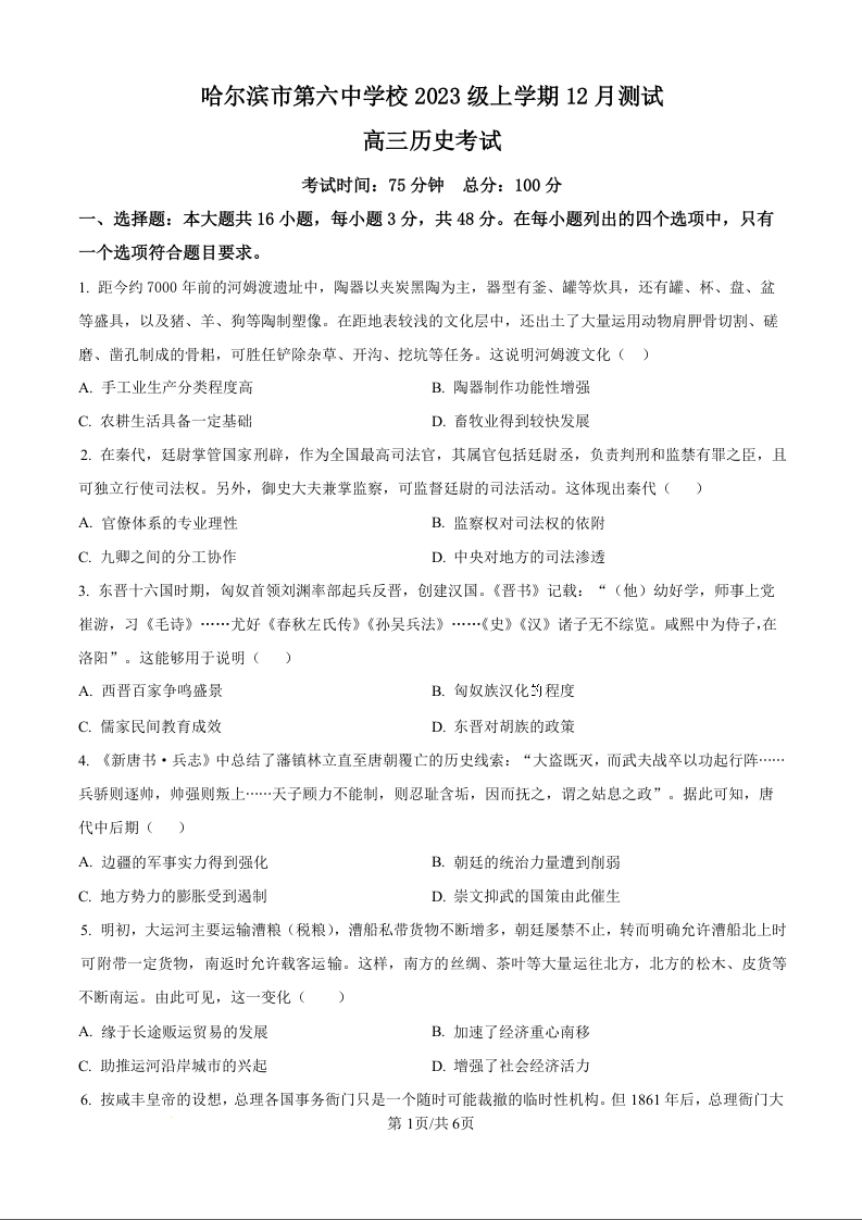 哈尔滨市第六中学校2023级上学期12月测试 历史.docx
