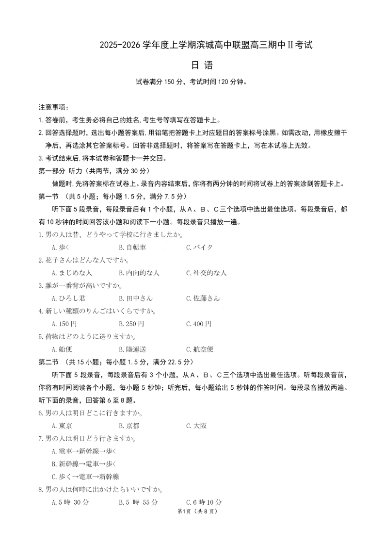 大连滨城高中联盟2025-2026学年度上学期高三期中Ⅱ考试 日语.pdf