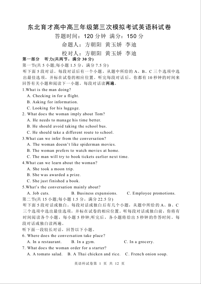 东北育才高中2026届高三年级第三次模拟考试 英语.docx