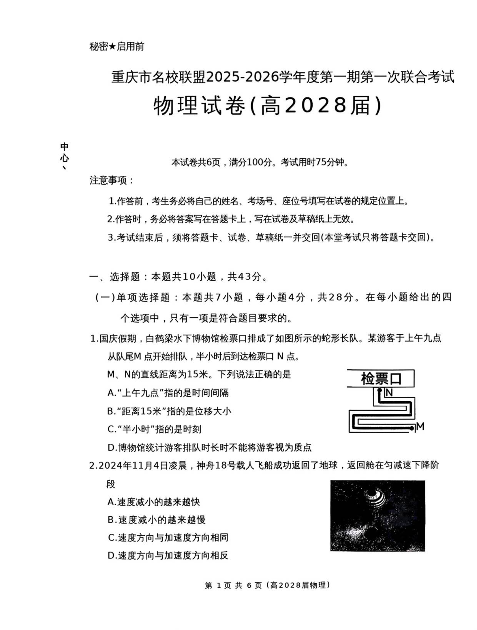 重庆市名校联盟2025-2026学年高一上学期11月期中联考 物理.pdf