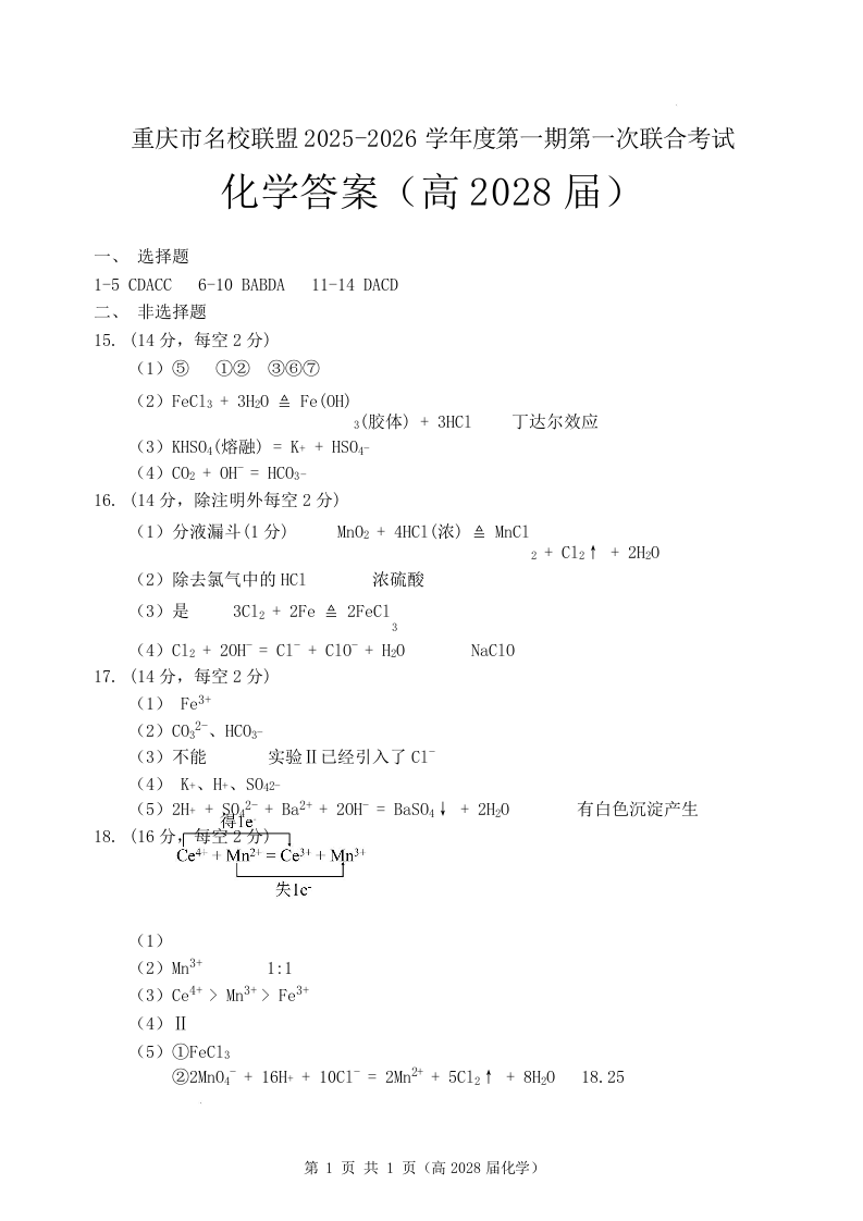重庆市名校联盟2025-2026学年高一上学期11月期中联考 化学答案.docx
