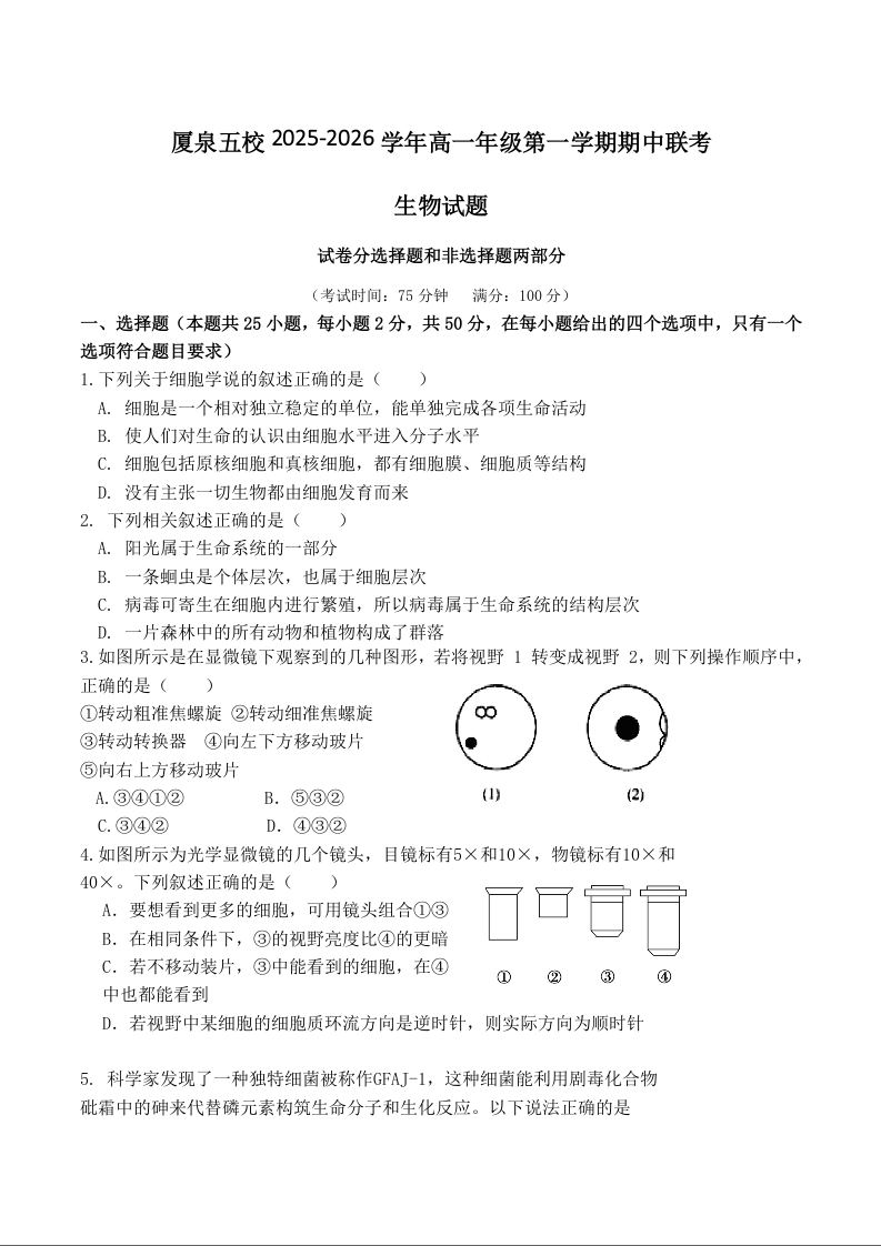 福建省厦泉五校2025-2026学年高一上学期期中联考 生物试题(含答案).docx