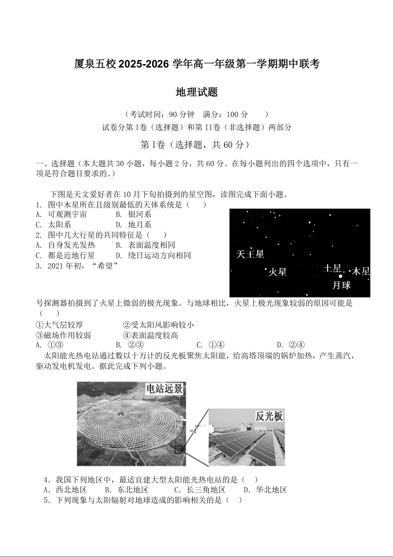 福建省厦泉五校2025-2026学年高一上学期期中联考 地理试题(含答案).docx