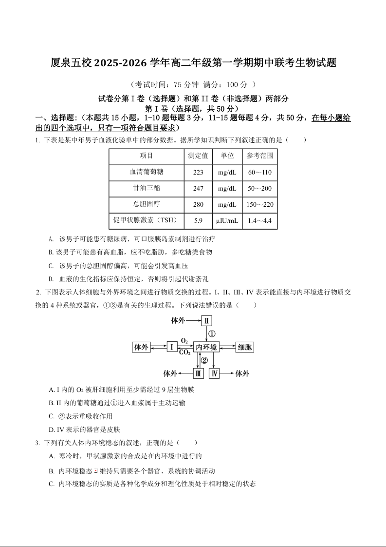福建省厦泉五校2025-2026学年高二上学期期中联考 生物试题(含答案).docx