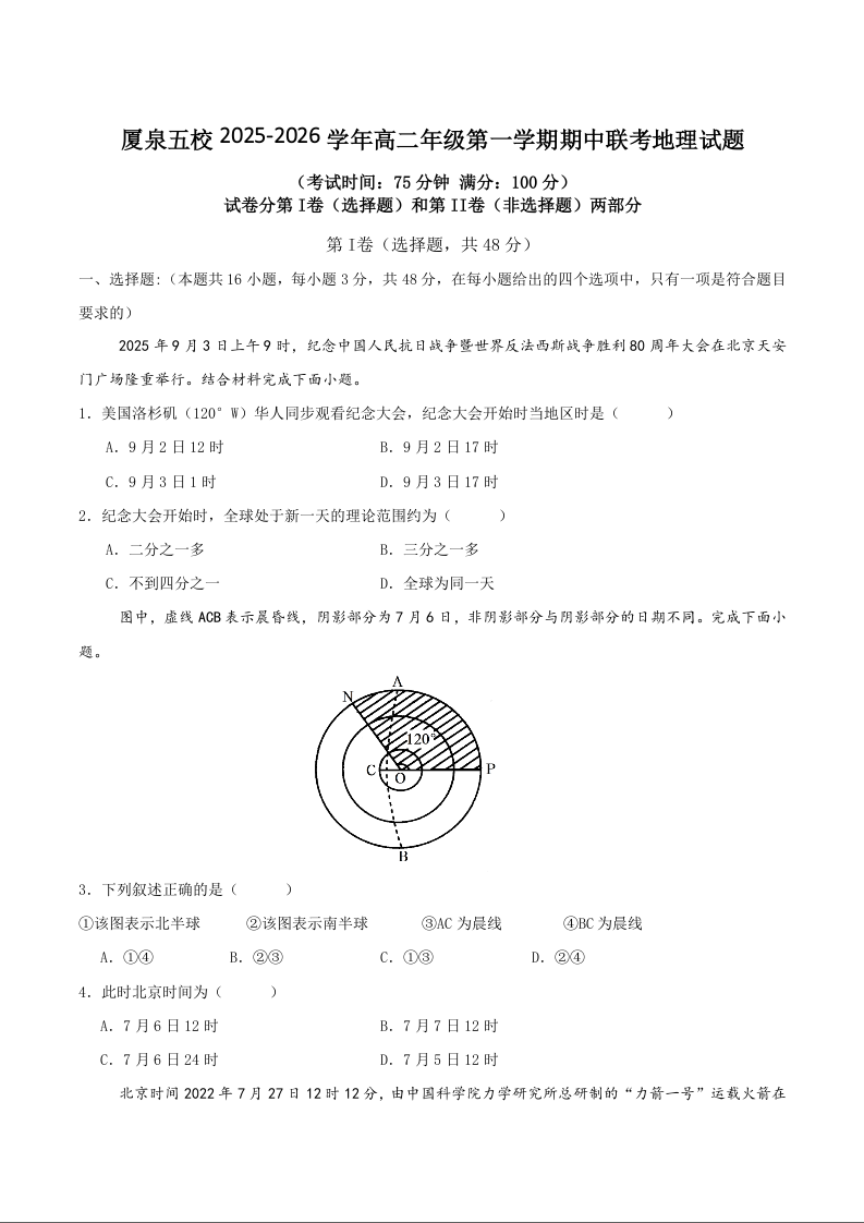 福建省厦泉五校2025-2026学年高二上学期期中联考 地理试题(含答案).docx