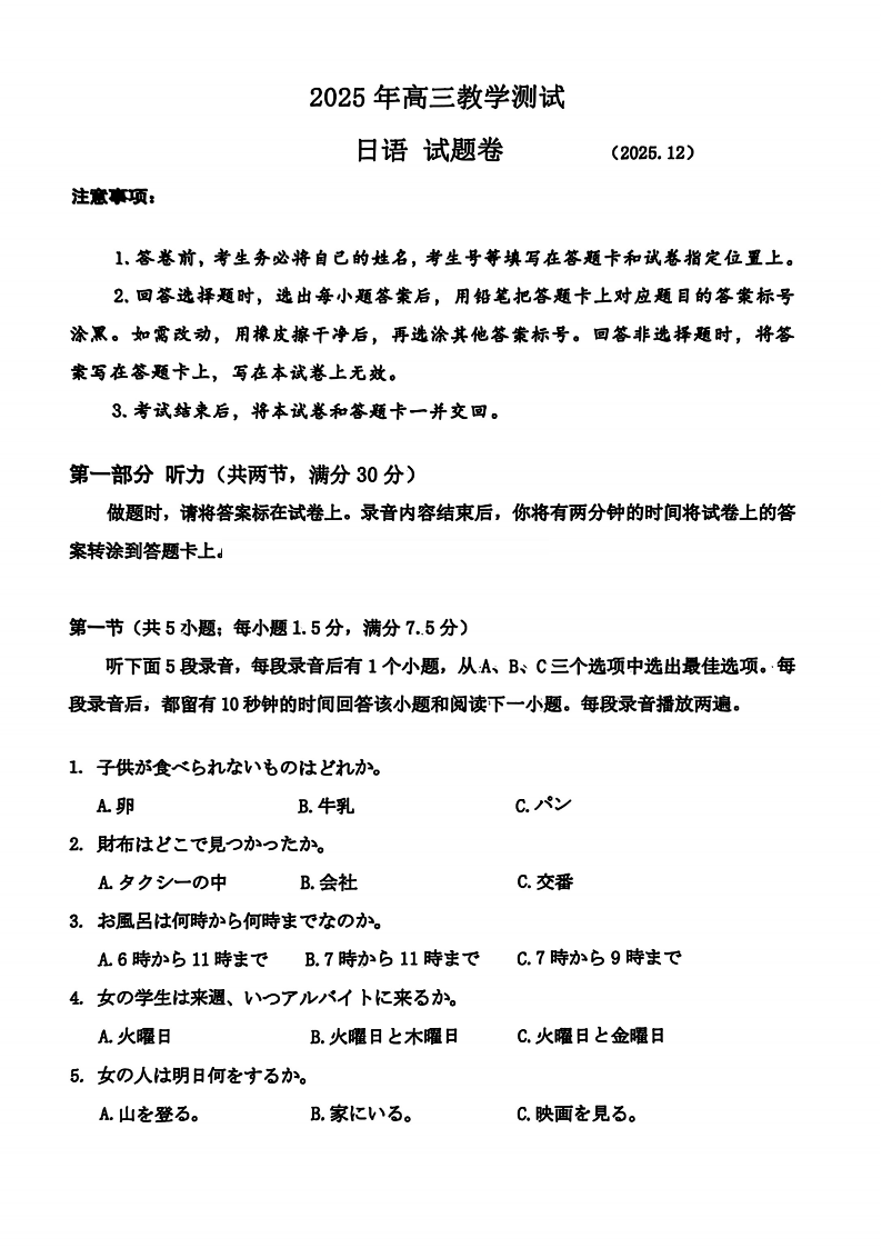 浙江省嘉兴市2025年12月教学测试(嘉兴一模)日语.pdf
