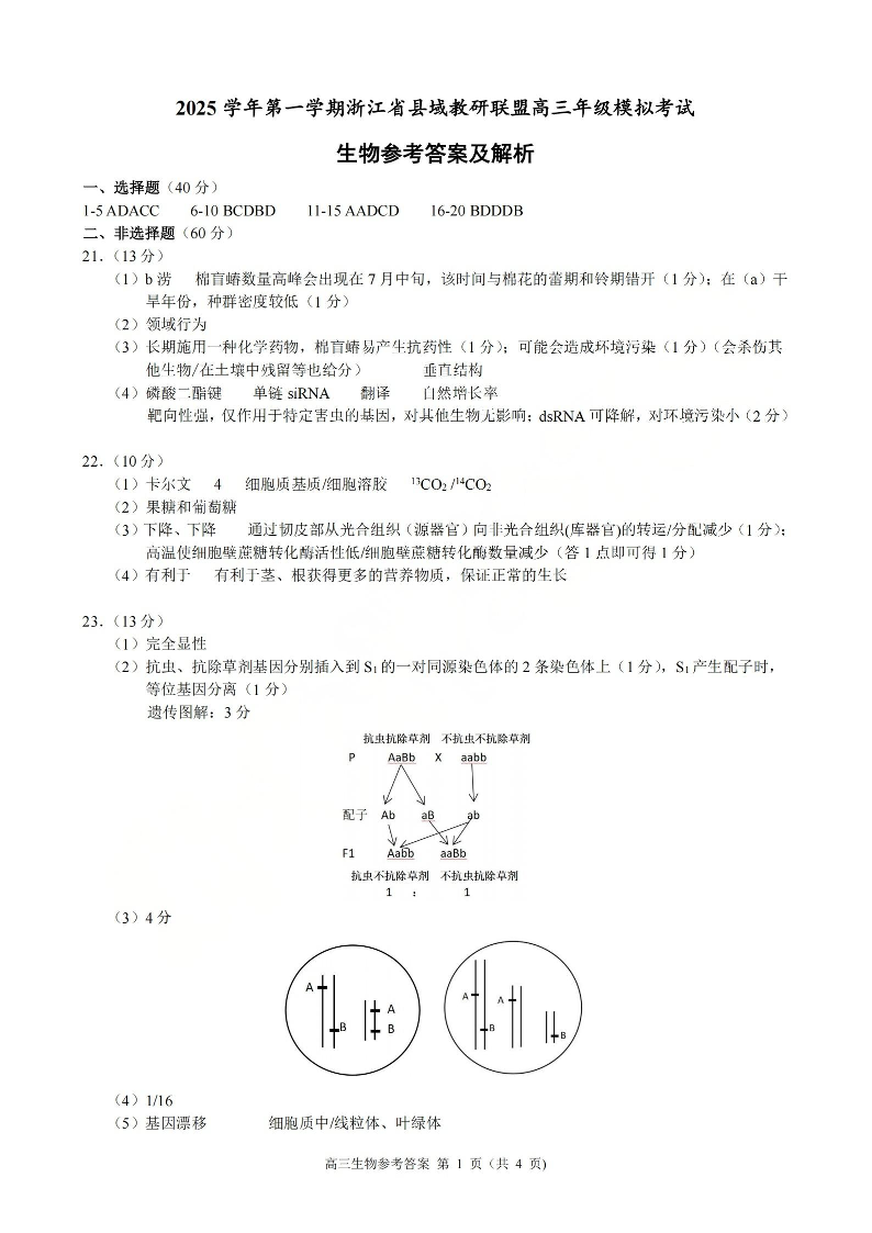 2025学年第一学期浙江省县域教研联盟高三年级模拟考试 生物答案.pdf
