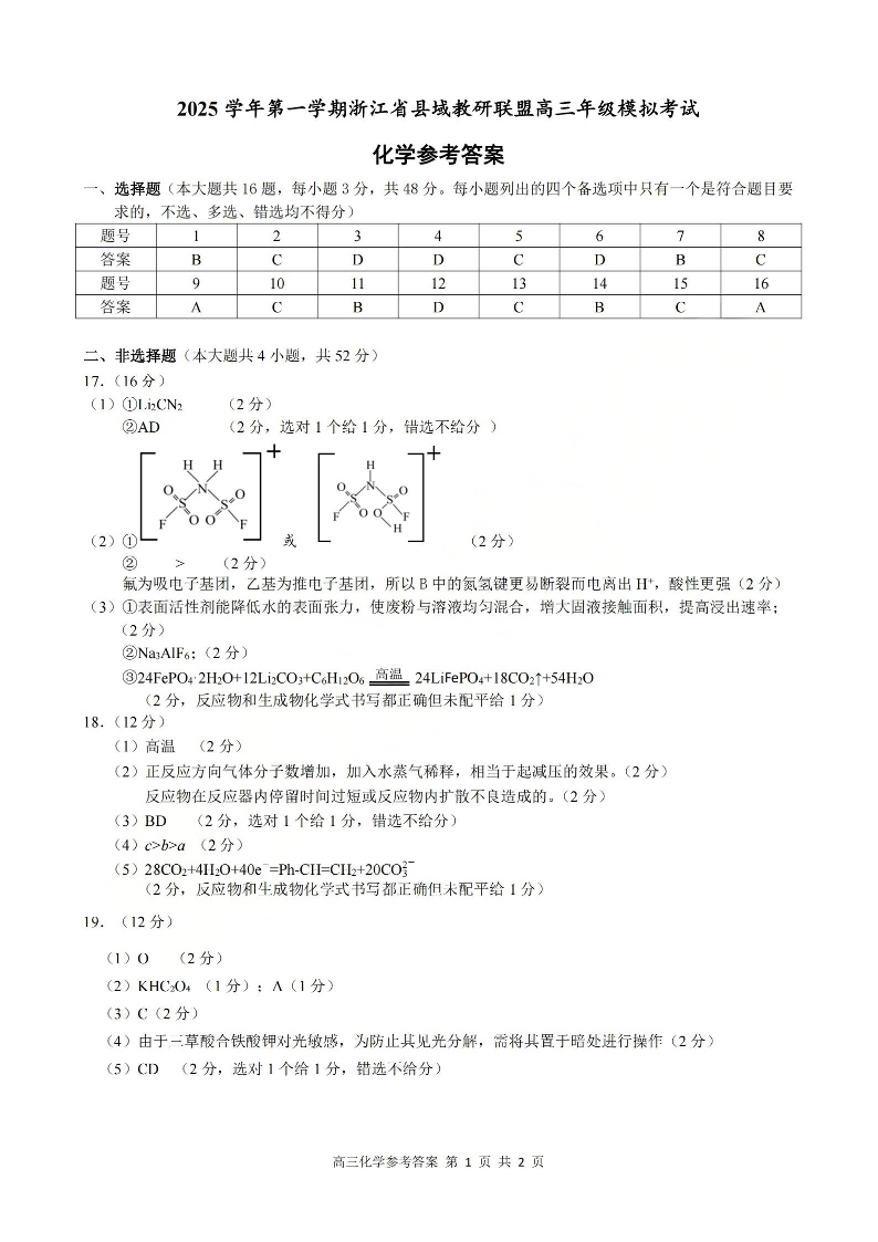 2025学年第一学期浙江省县域教研联盟高三年级模拟考试 化学答案.pdf