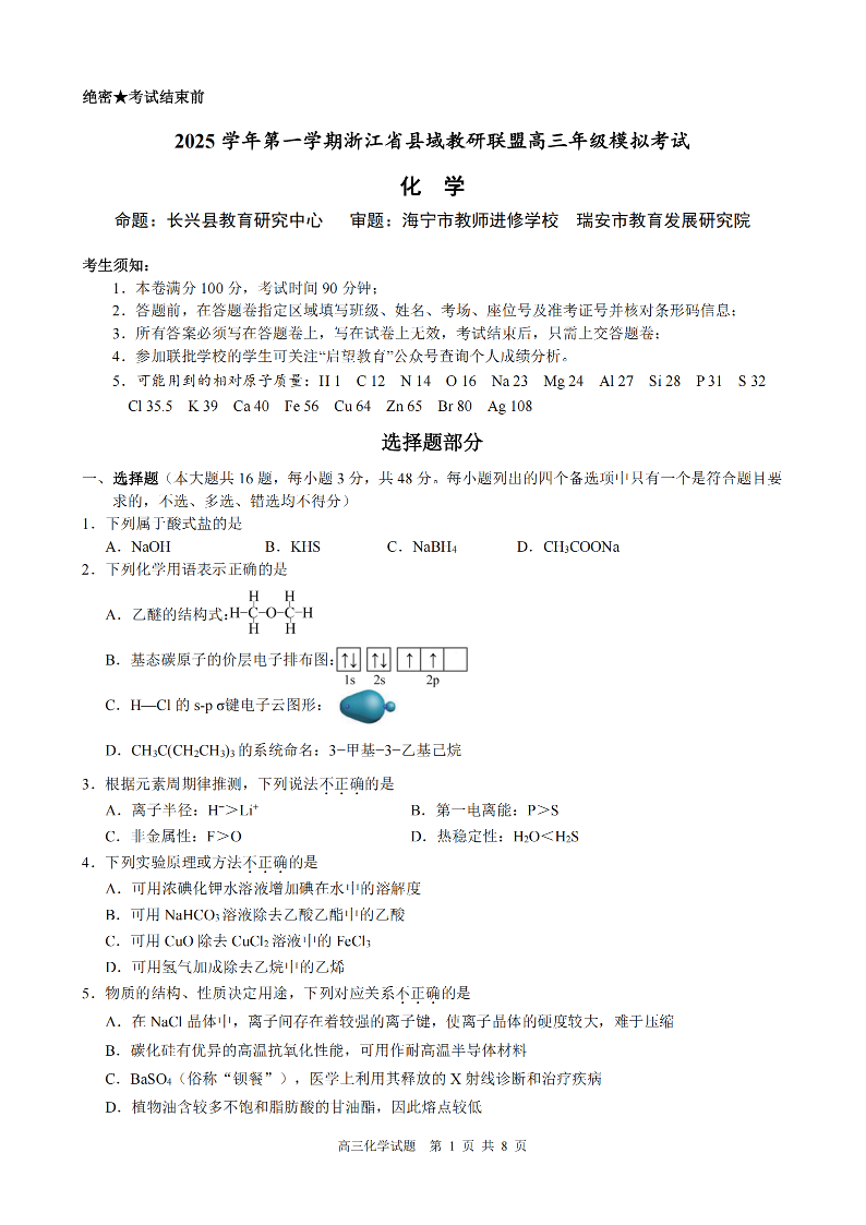 2025学年第一学期浙江省县域教研联盟高三年级模拟考试 化学.pdf