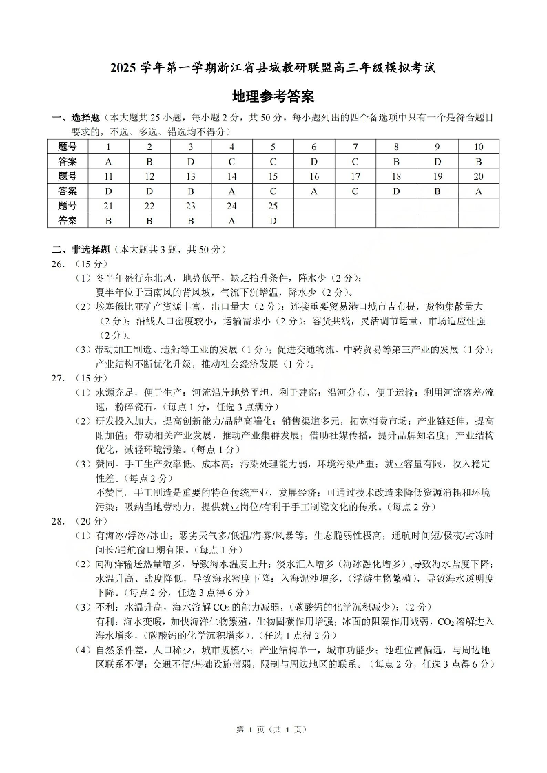 2025学年第一学期浙江省县域教研联盟高三年级模拟考试 地理答案.pdf