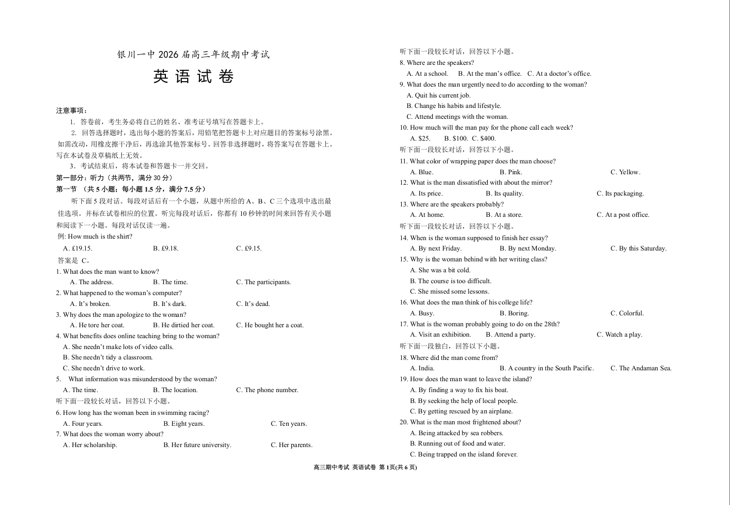 宁夏银川第一中学2026届高三上学期期中考试 英语.docx