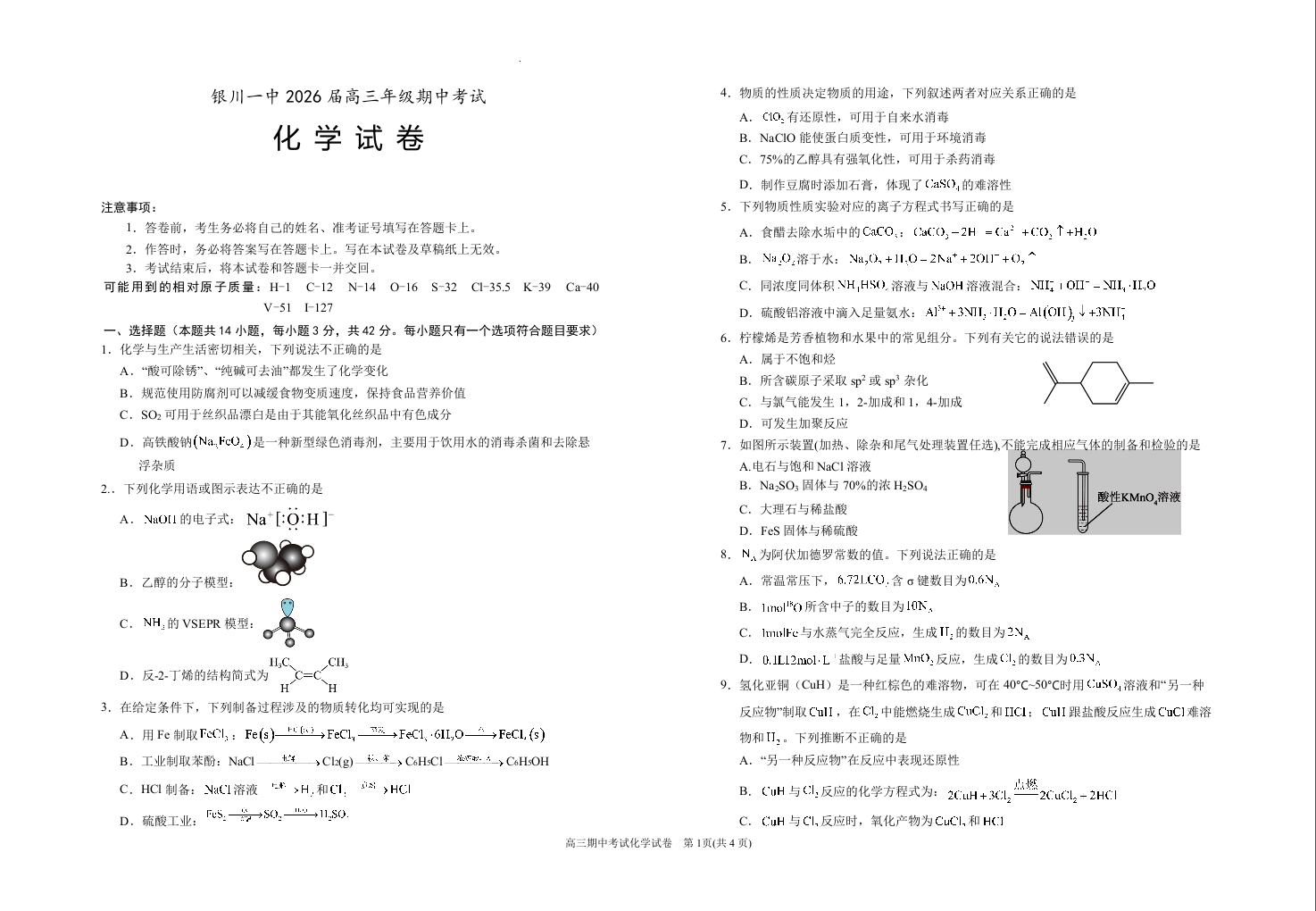 宁夏银川第一中学2026届高三上学期期中考试 化学.docx