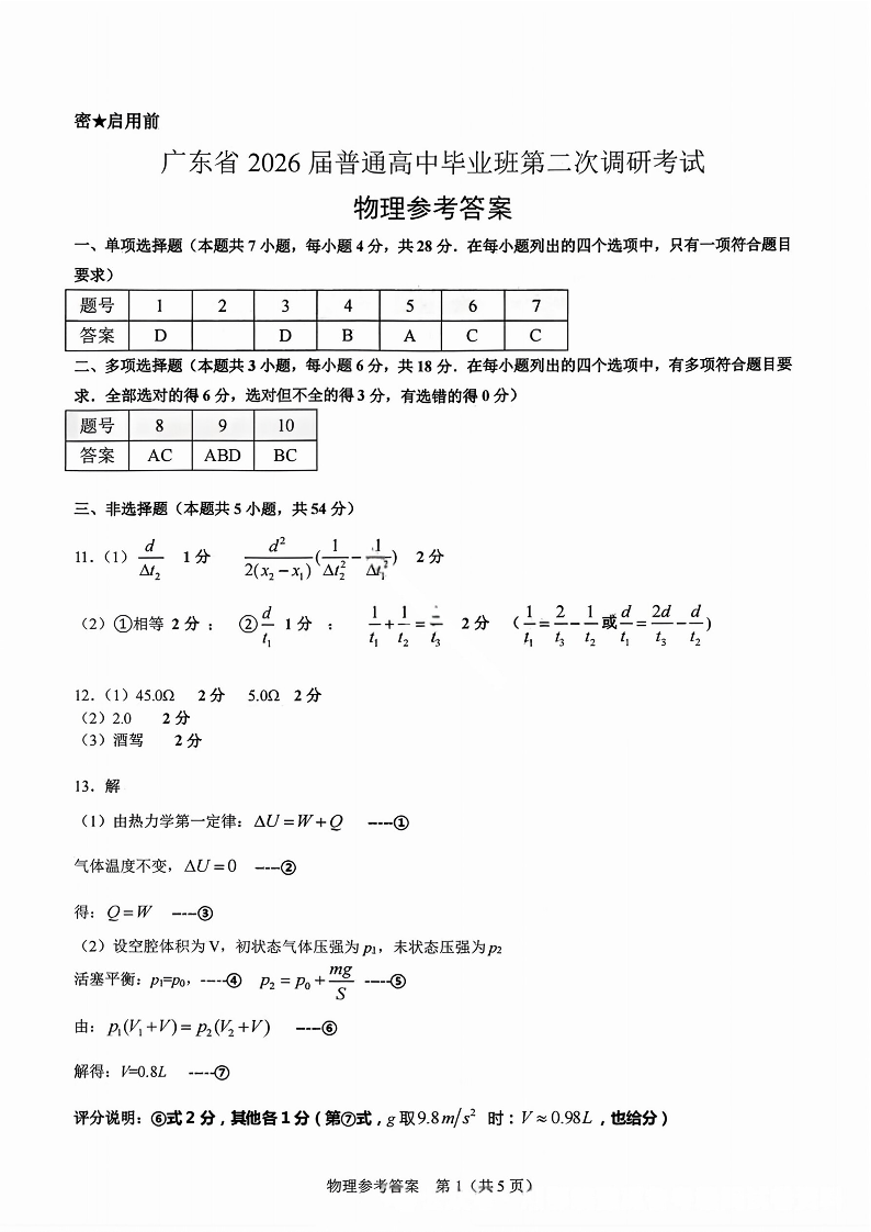 光大联考2026届普通高中毕业班第二次调研考试 物理答案.pdf
