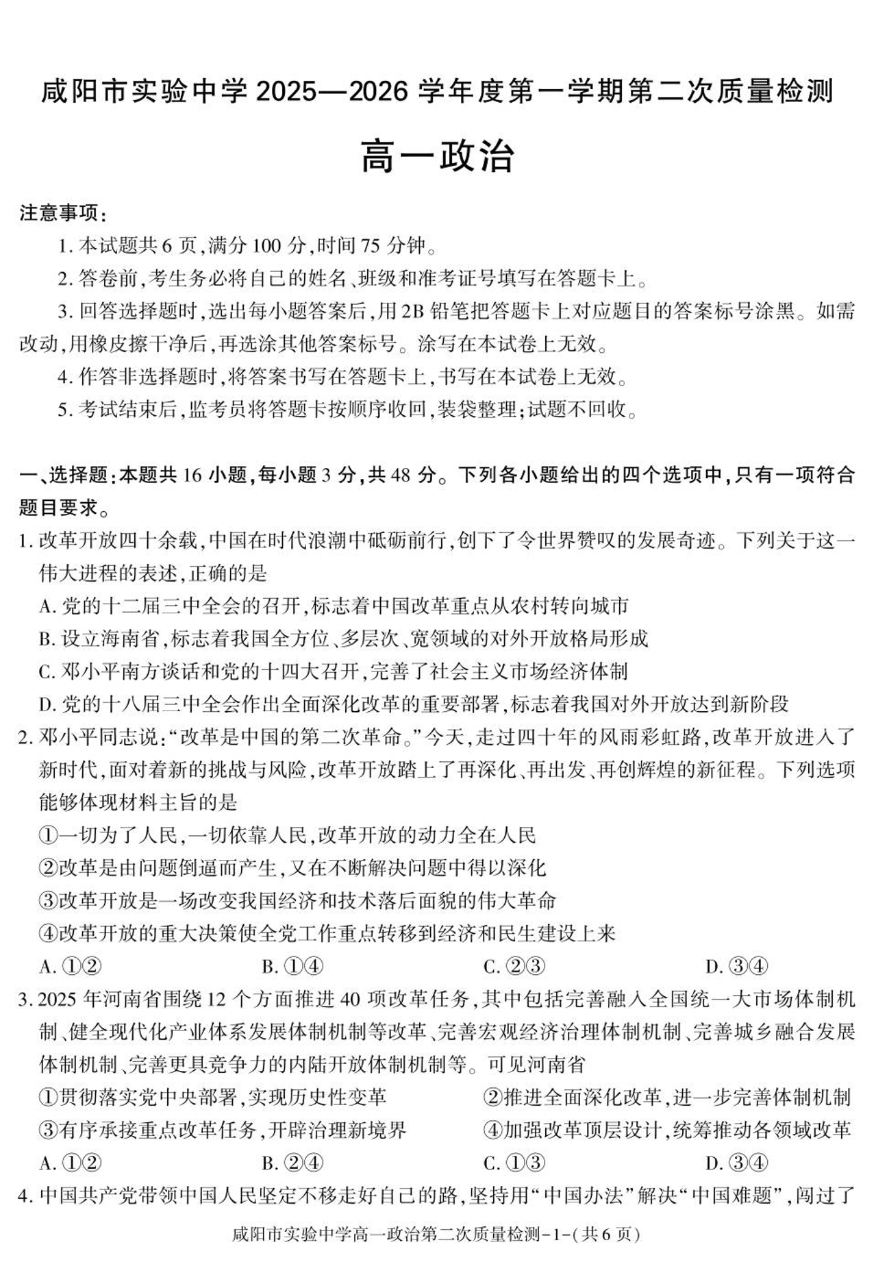 陕西省咸阳市实验中学2025-2026学年高一上学期第二次质量检测 政治试题(含答案).pdf