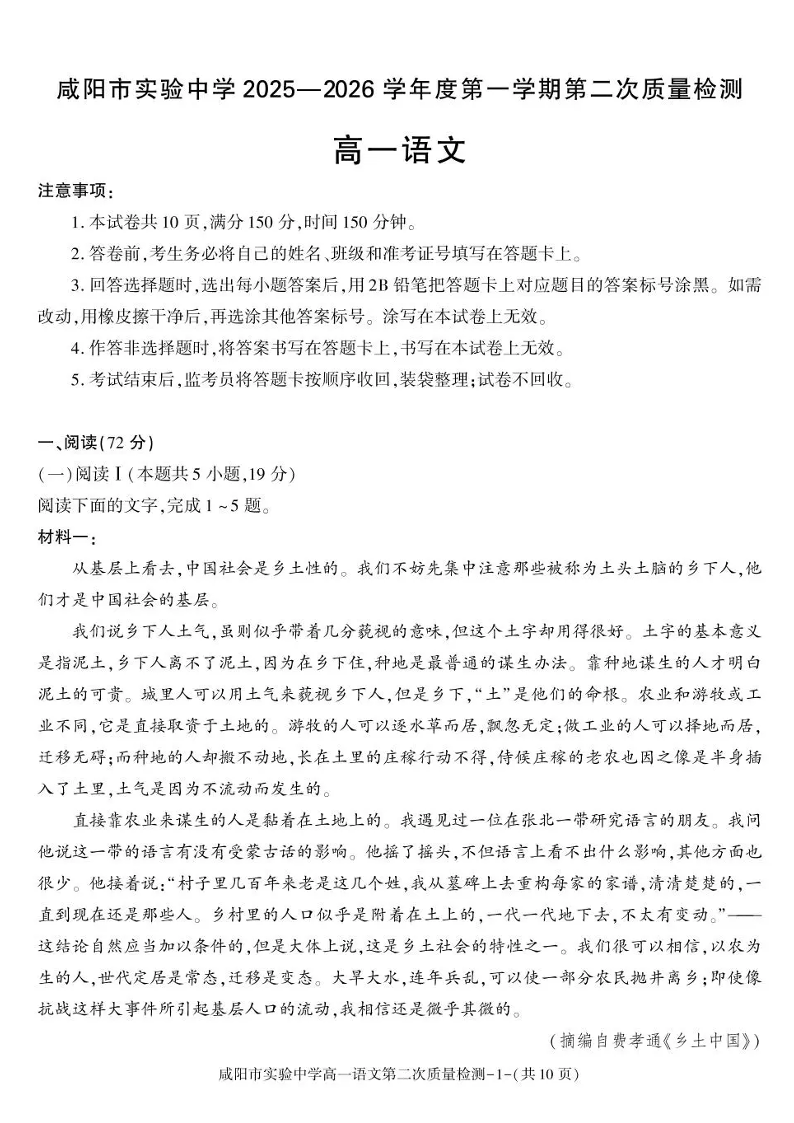 陕西省咸阳市实验中学2025-2026学年高一上学期第二次质量检测 语文试题(含答案).pdf
