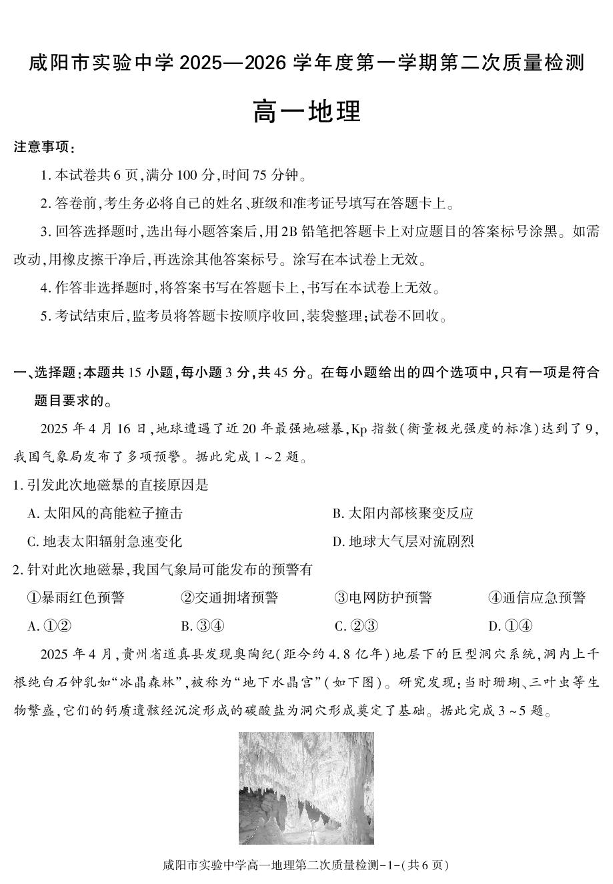 陕西省咸阳市实验中学2025-2026学年高一上学期第二次质量检测 地理试题(含答案).pdf