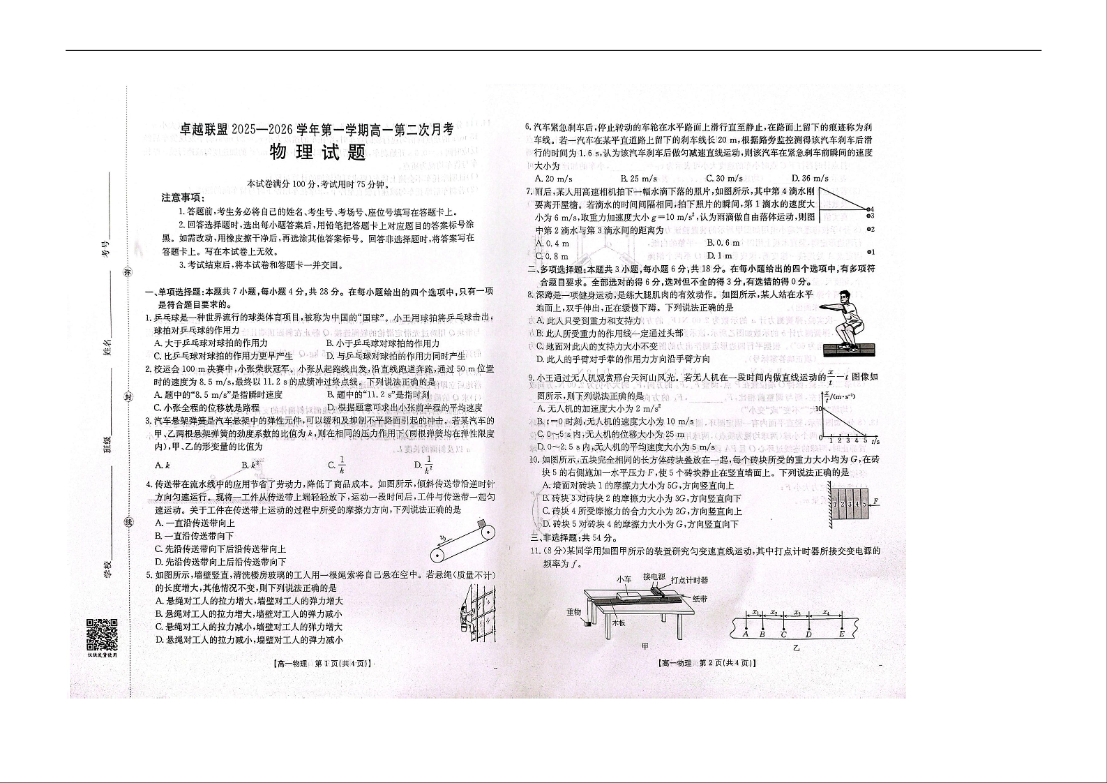 河北邢台市卓越联盟2025-2026学年高一上学期期中考试 物理.docx