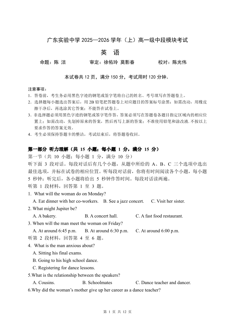 广东省实验中学2025-2026学年高一上学期期中考试 英语.pdf