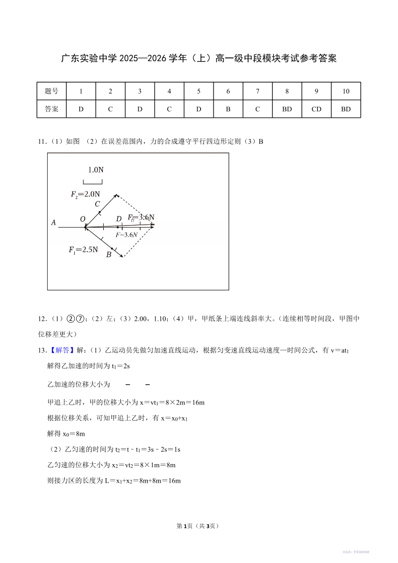 广东省实验中学2025-2026学年高一上学期期中考试 物理答案.pdf