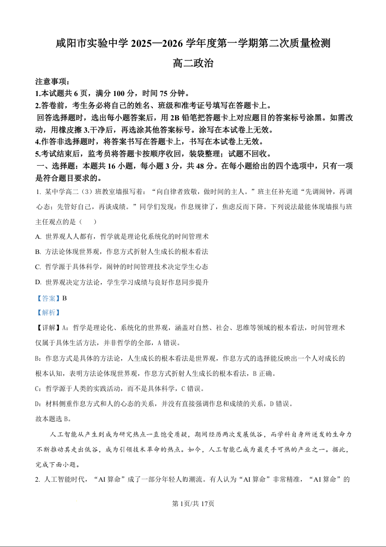 陕西省咸阳市实验中学2025-2026学年高二上学期第二次质量检测 政治答案.docx