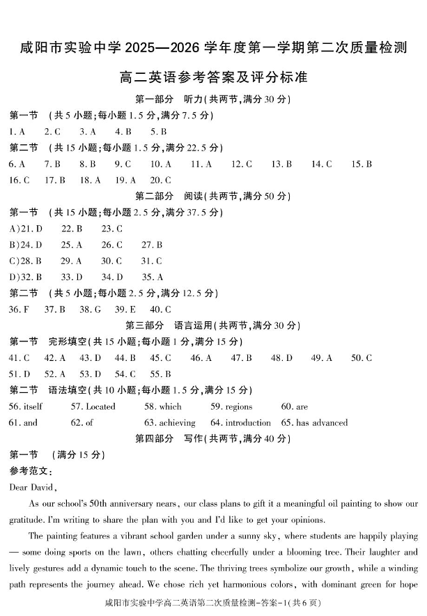 陕西省咸阳市实验中学2025-2026学年高二上学期第二次质量检测 英语答案.pdf