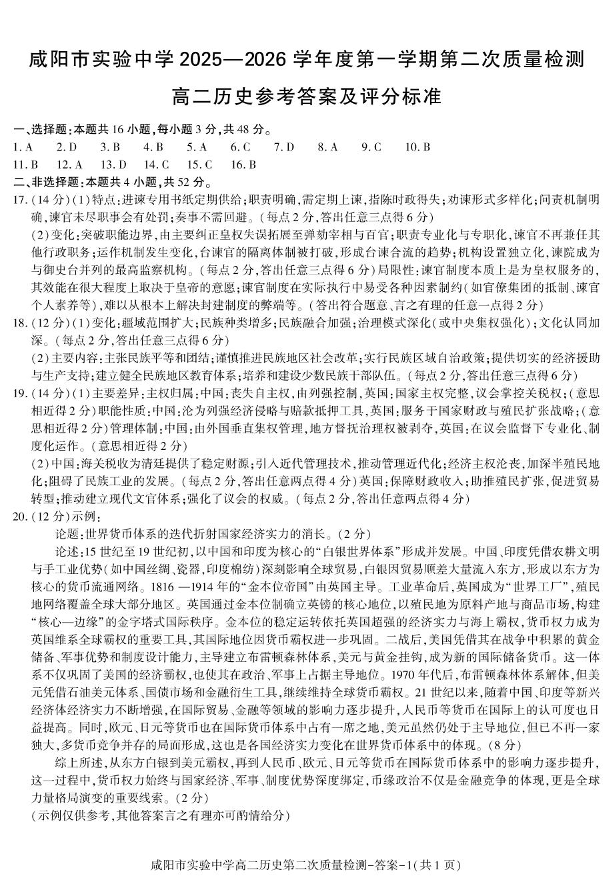 陕西省咸阳市实验中学2025-2026学年高二上学期第二次质量检测 历史答案.pdf