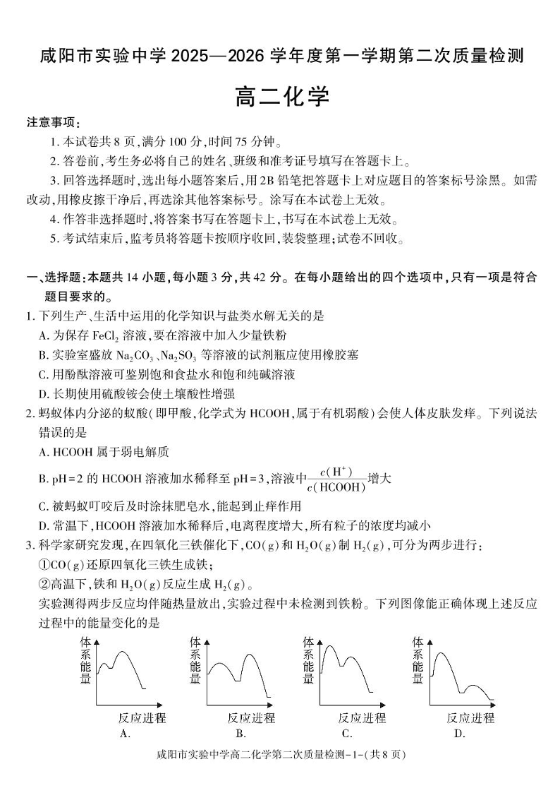 陕西省咸阳市实验中学2025-2026学年高二上学期第二次质量检测 化学试题(含答案).pdf