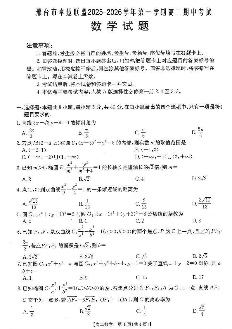 河北省邢台市卓越联盟2025-2026学年高二上学期12月期中考试 数学试题(含答案).pdf