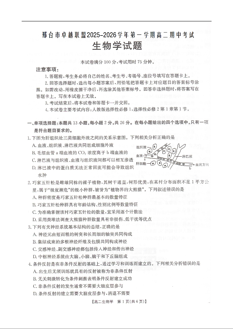 河北省邢台市卓越联盟2025-2026学年高二上学期12月期中考试 生物试题(含答案).docx
