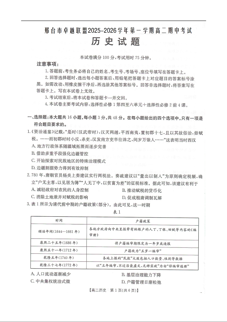 河北省邢台市卓越联盟2025-2026学年高二上学期12月期中考试 历史试题(含答案).docx