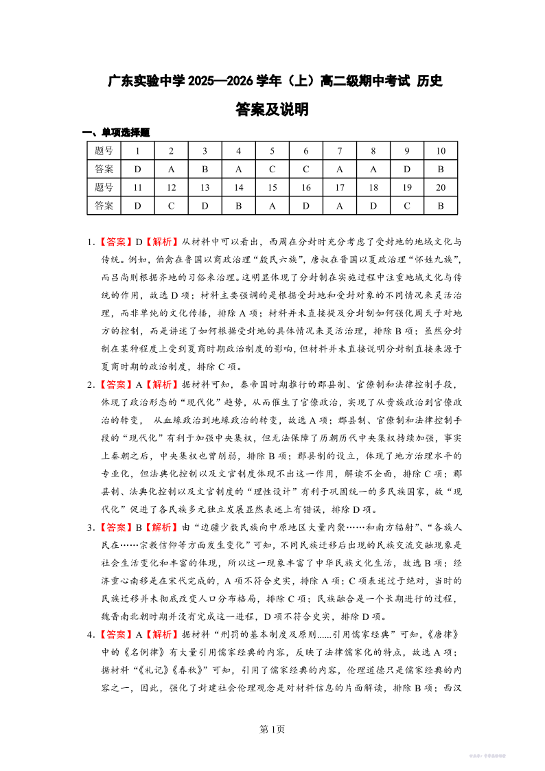 广东省实验中学2025-2026学年高二上学期期中考试 历史答案.pdf