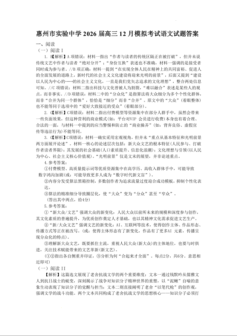 广东省惠州市实验中学2026届高三上学期12月阶段性检测 语文答案.docx