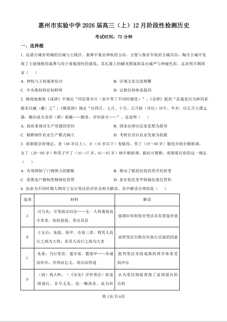 广东省惠州市实验中学2026届高三上学期12月阶段性检测 历史.docx