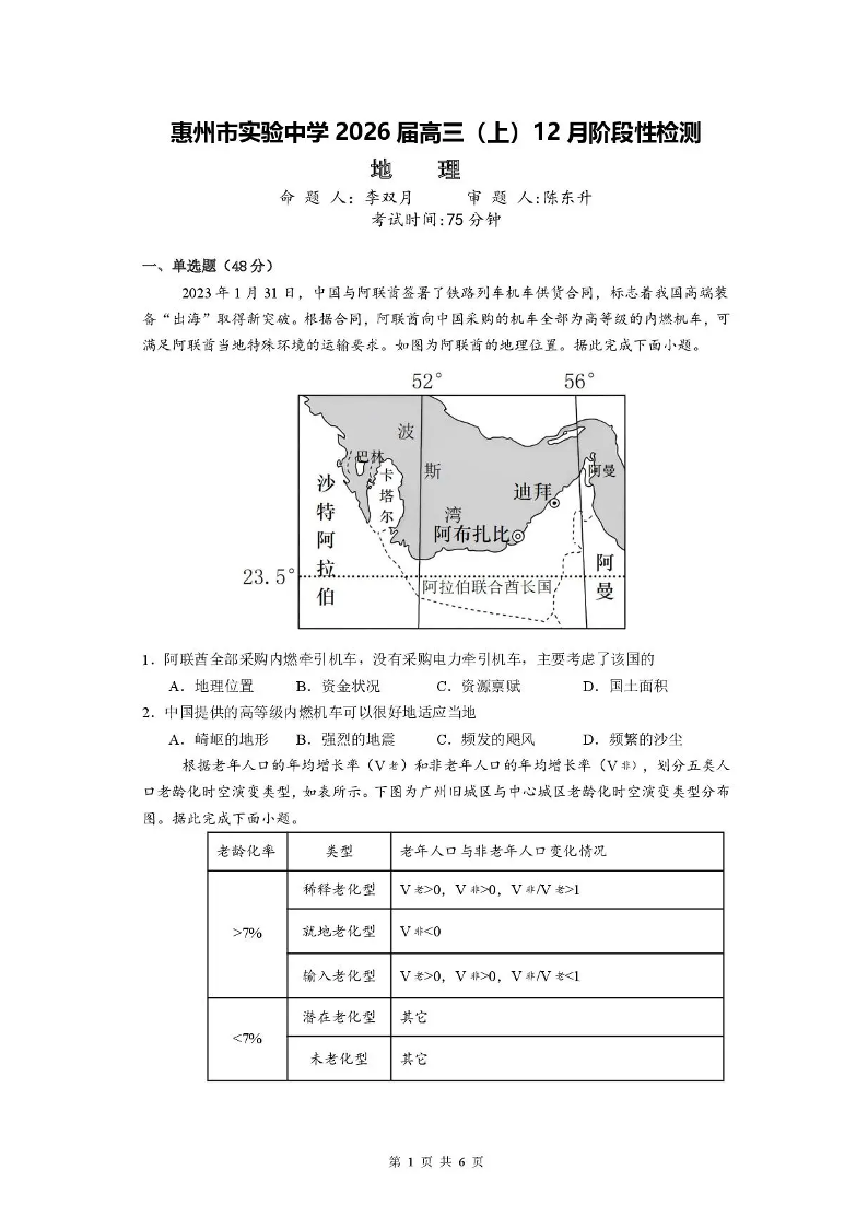 广东省惠州市实验中学2026届高三上学期12月阶段性检测 地理.pdf