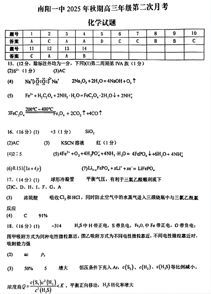 南阳一中2025年秋期高三年级第二次月考 化学答案.pdf
