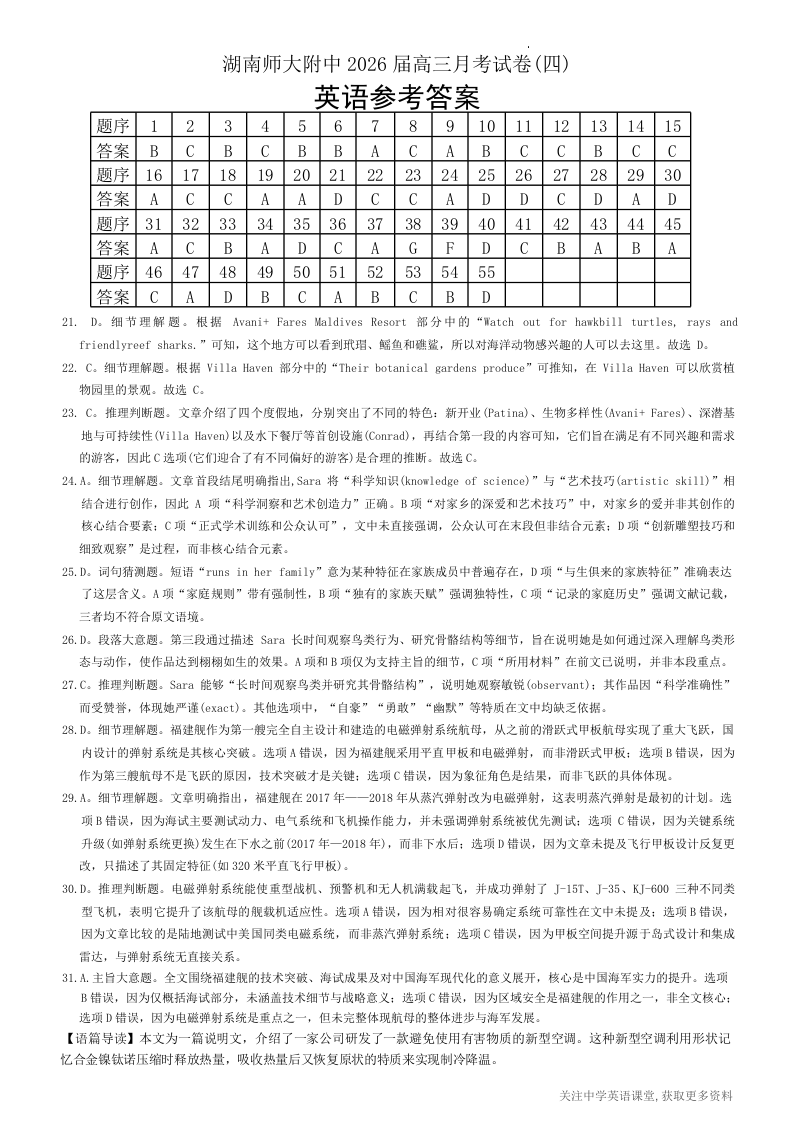 湖南师大附中2026届高三月考试卷(四)英语答案.docx