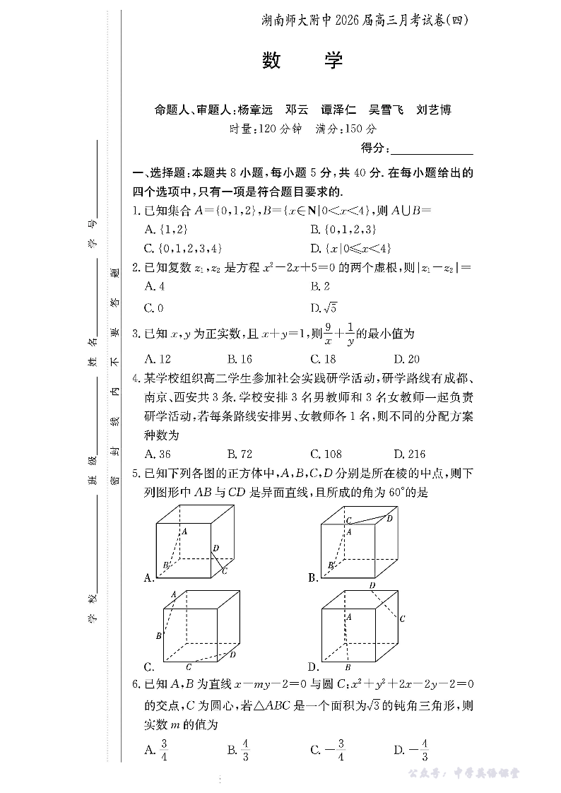 湖南师大附中2026届高三月考试卷(四)数学.pdf